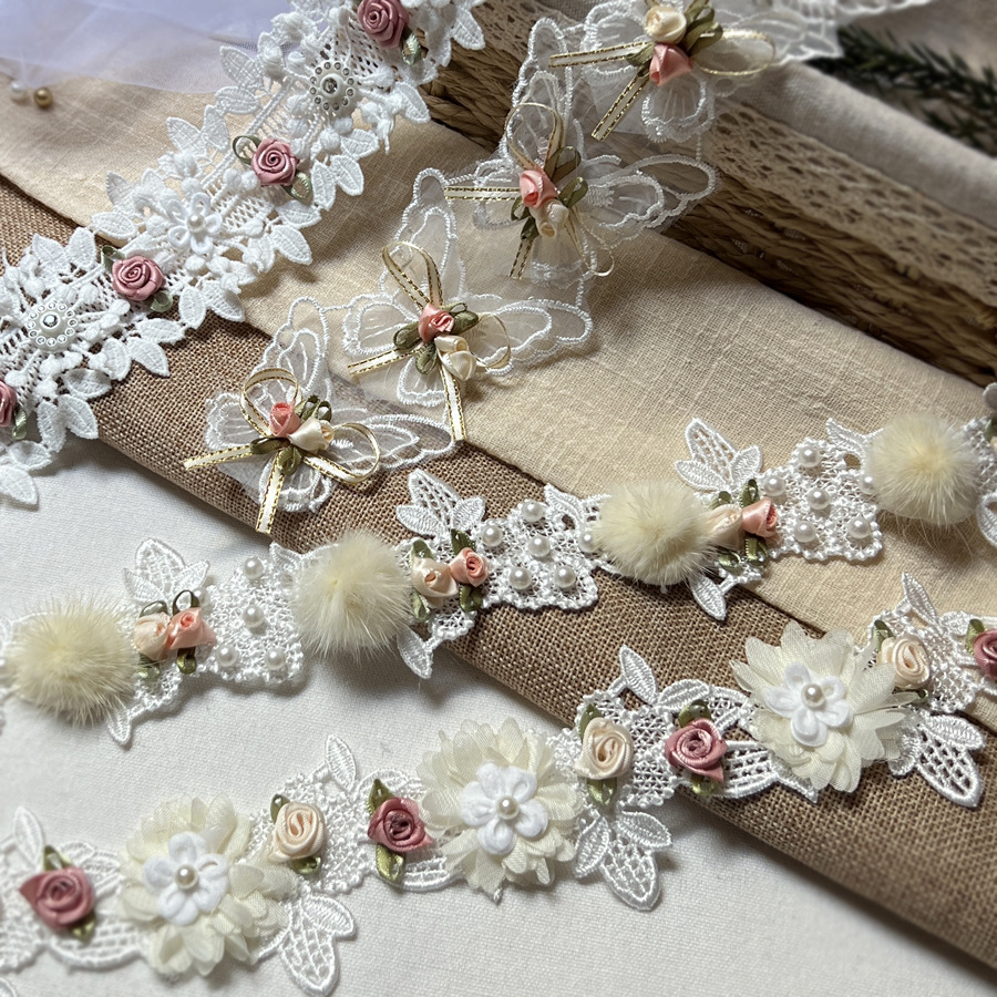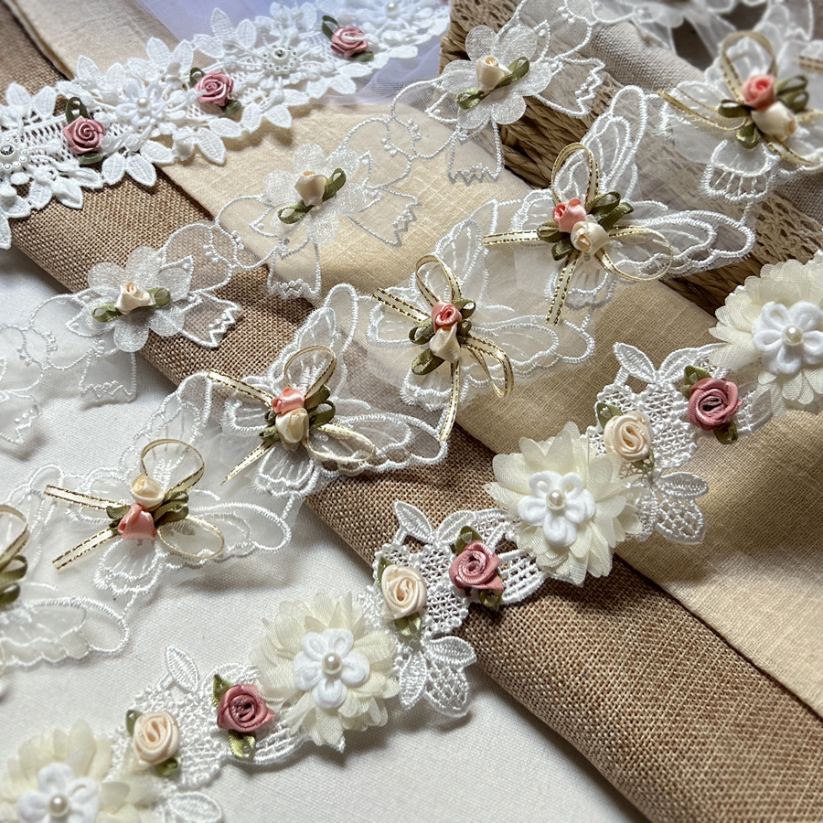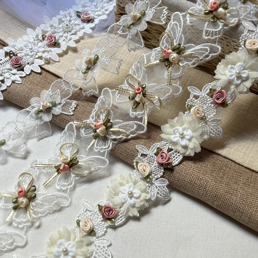 Handmade DIY Pink White Chiffon Leaf Eight Petals Pearl Flower Lace Trim For Child Clothes WB39