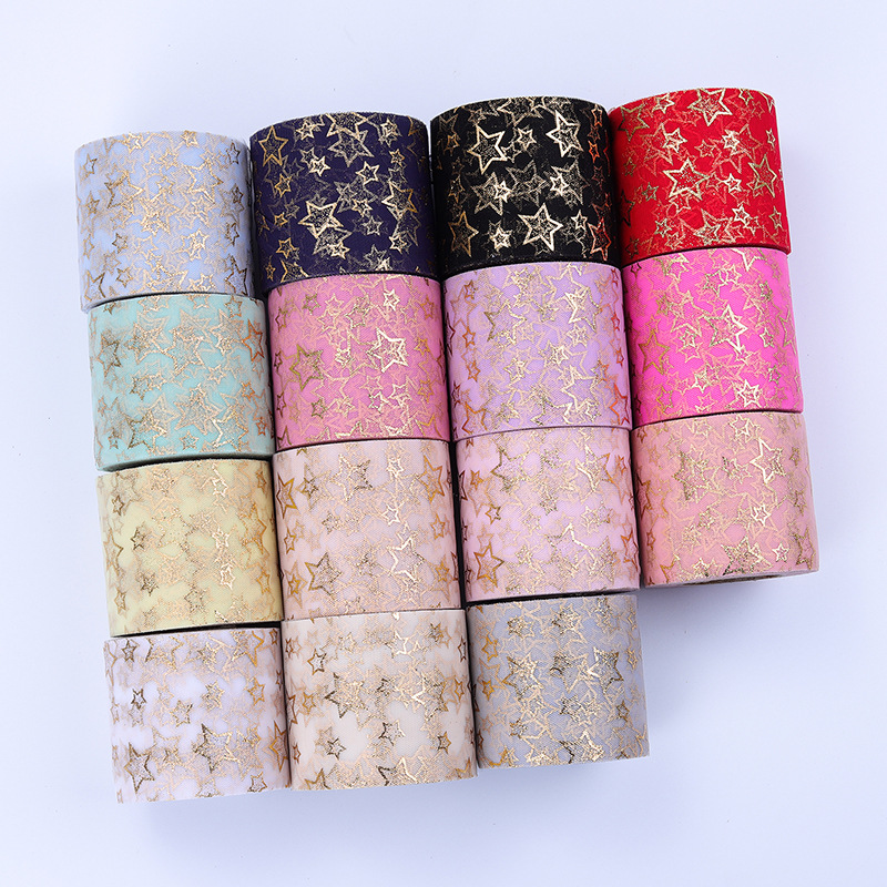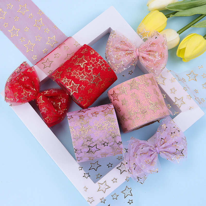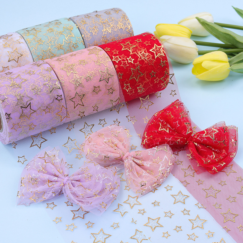 6/8/10/12cm*10yards High-density hollow gold-stamped five-pointed star mesh ,DIY Hair Accessories Material Bowknot Printing H802