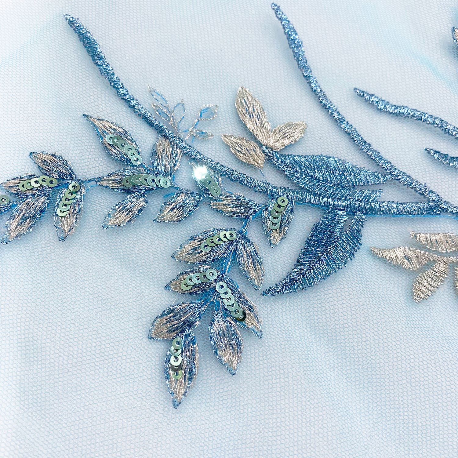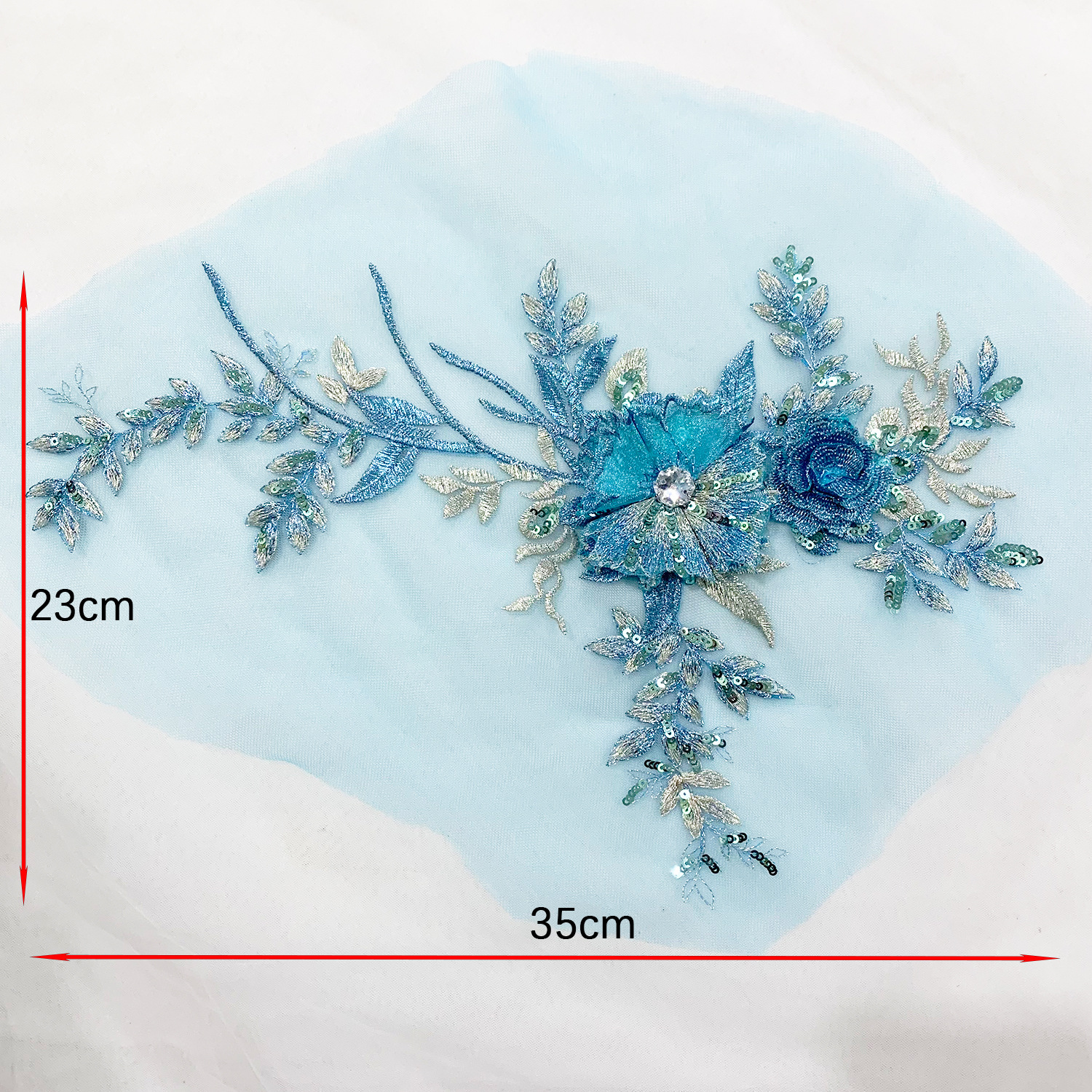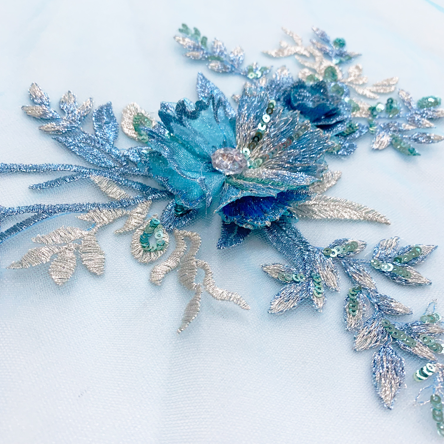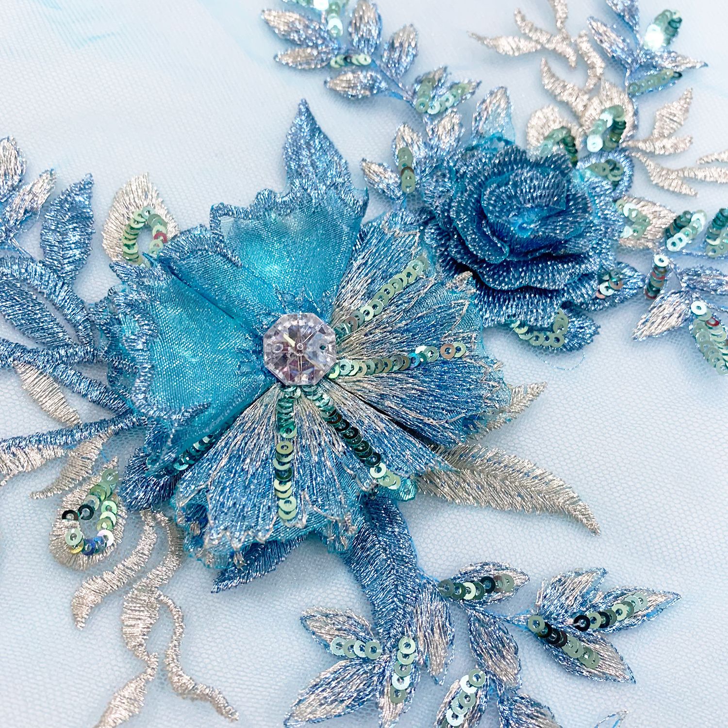 3D Blue Polyester Embroidery Flower Lace Chest Applique with Sequins Rhinestone